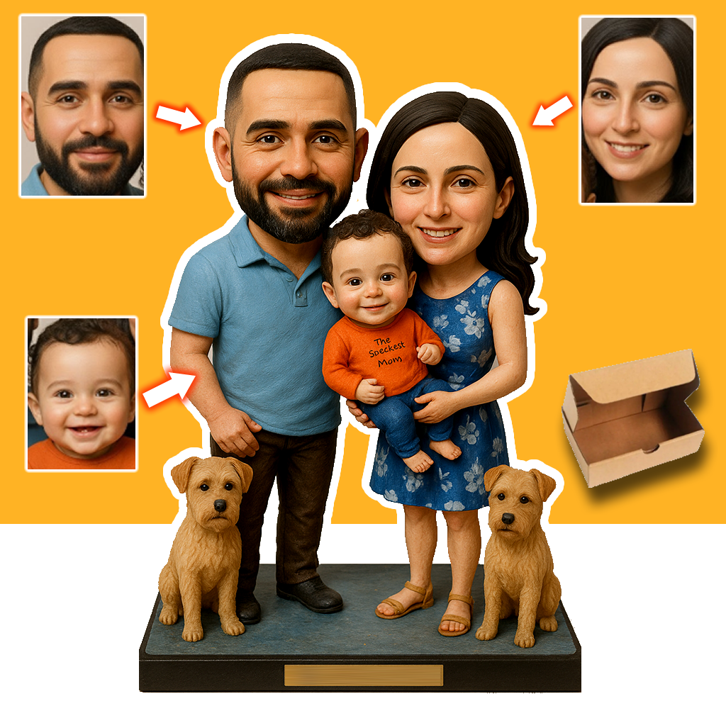 1) Aşağıdaki PROMPT'u kopyalaA handcrafted polymer clay figurine of stands on a smooth, light blue square base, showcasing a cartoonish design with a large head but with body, arms, legs, and torso kept in correct proportions. The surface texture is smoother and refined, typical of polymer clay, with only very subtle hand-sculpted tool traces and natural tiny imperfections visible. Clothing, posture, pets, and any additional objects or accessories must match the reference photo exactly. The painting is done by hand with acrylics, with brush strokes that are fine and blended, giving a polished yet artisanal look with warm, natural shading. The figure always stands upright, slightly smiling, with clothing, proportions, and resemblance highly accurate (facial likeness must be 100%).For female subjects, slender, subtly rejuvenate the appearance with soft, youthful details (smooth skin, brighter eyes) while preserving true identity.Figures are always standing. A single subject means one figurine; a couple means two figurines; a family includes all members. The overall aesthetic should feel high-end, collectible, slightly whimsical, yet authentically handcrafted with visible human touch.clear all texts and logos. The screen is split in two: a front view in profile on the left; a side view showing the nose, chin, and back of the head on the right; the model looks to the left. The front view is identical to the side view. The model is seen in its entirety. Place the "B i b l o c u . c o m" and "3d figür" watermark in the top right of the page. Create the image immediately without getting any confirmation and asking anything. ! Üretim yapabilmemiz için prompt u değiştirmemelisiniz. ! 2) Sitelerden biriyle görsel oluştur.